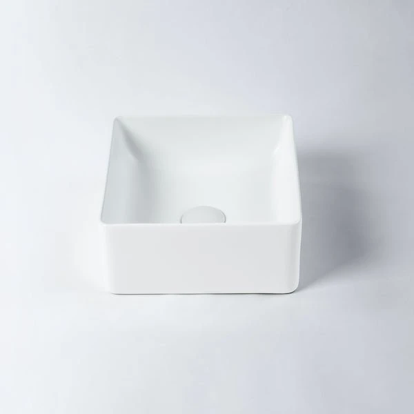 A mini gloss white ceramic square basin perfect for smaller bathroom spaces