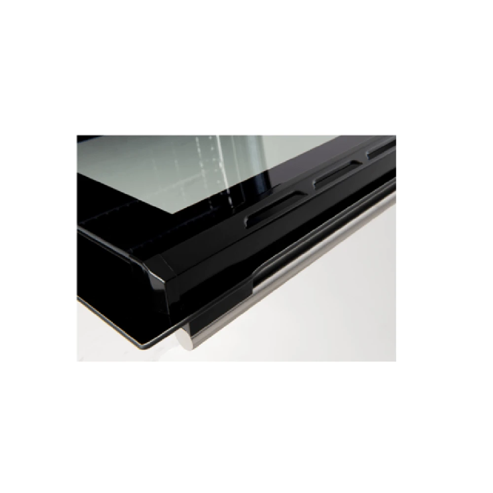 - Black glass finish with stainless steel trim