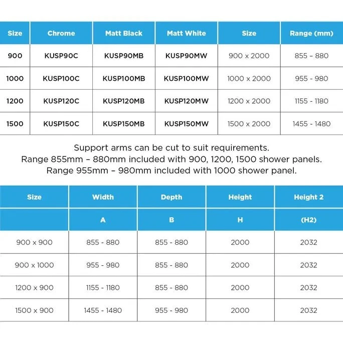 - Range 860mm-885mm included with 900,1200,1500 shower panel