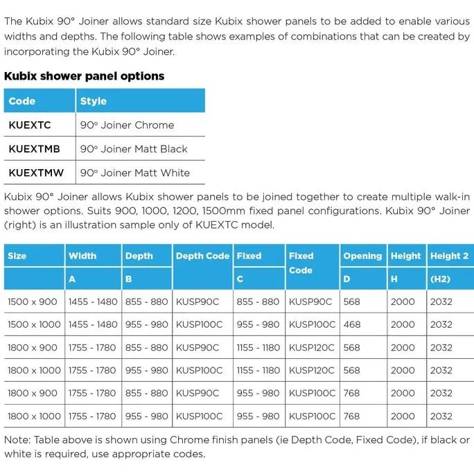 - The Kubix 90° Joiner allows standard size Kubix shower panels to be added to enable various widths and depths. The following table shows examples of combinations that can be created by incorporating the Kubix 90° Joiner.