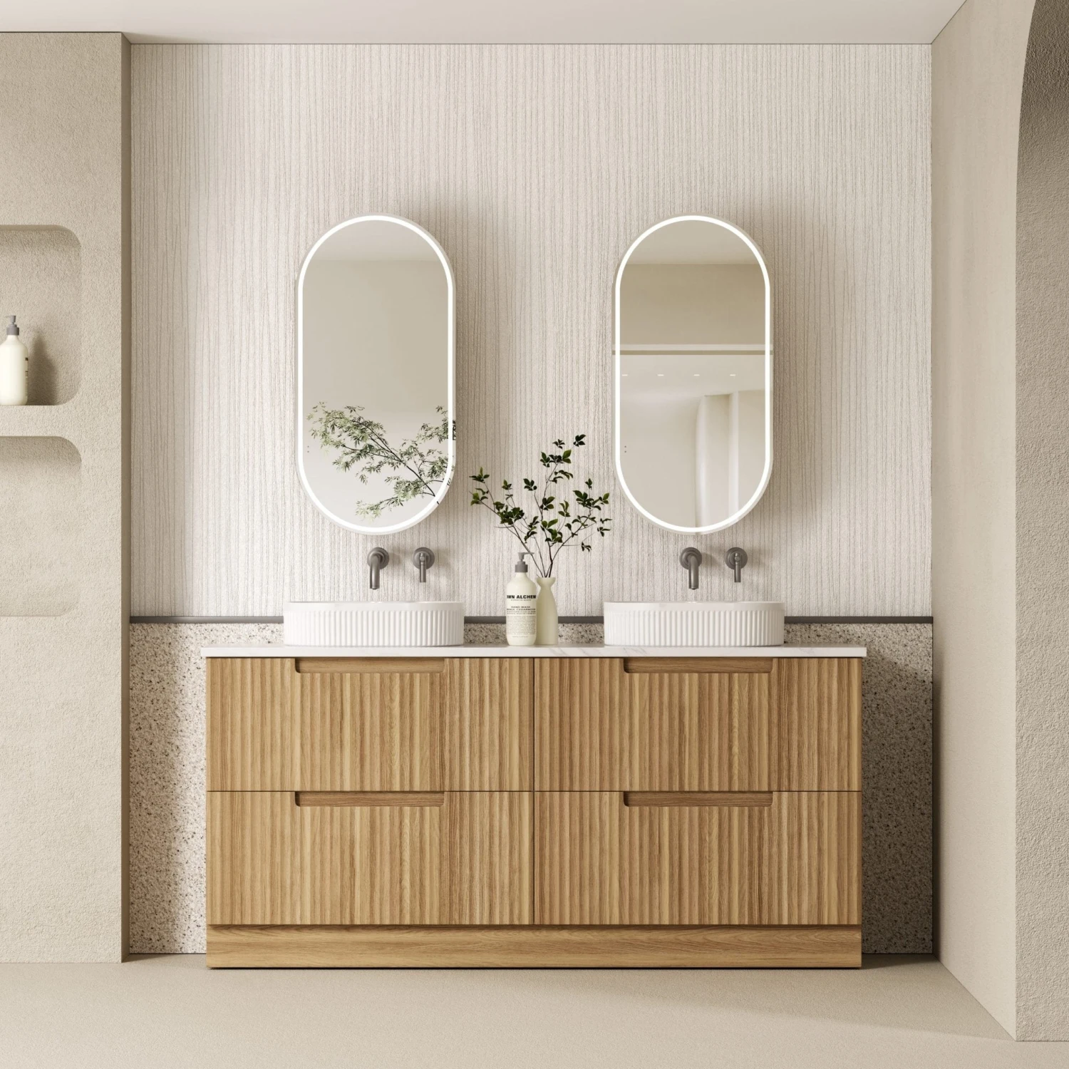 The Lovina floor-standing vanity showcases natural sophistication with its Harvest Oak wave groove design. Its spacious stacked drawers offer versatile storage, while Hettich Quadro S soft-close runners ensure seamless functionality. A perfect match for serene, light-filled bathrooms.