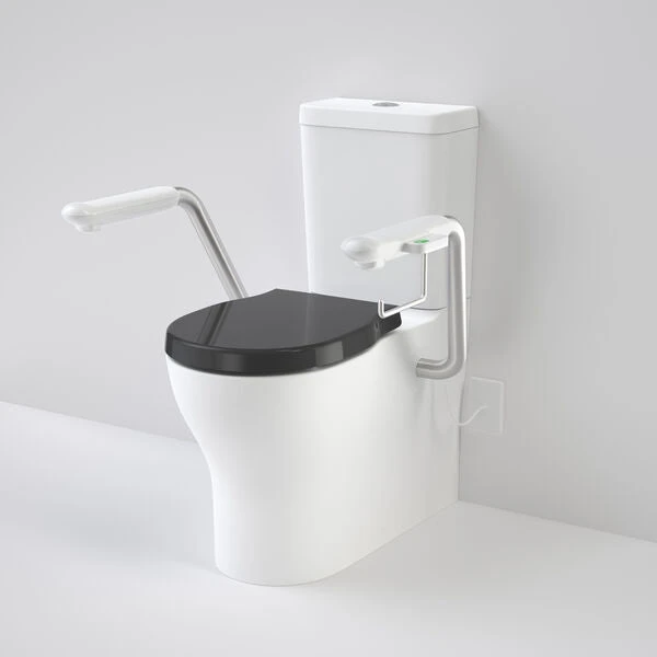 - Includes integrated stainless steel armrests (each arm load tested to 160kg, no structural wall required for install, inbuilt safety locking mechanism, Includes toilet roll holder on left arm)