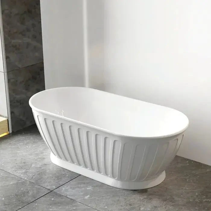 Shell bath features a rolled top, fluted body design with a plinth detailed base.
